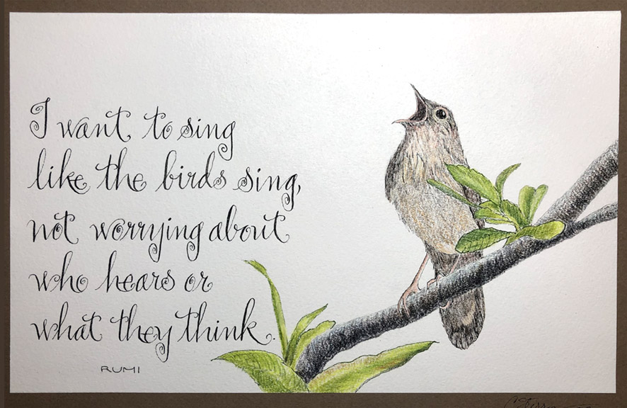9 1/2” x 6” Illustration: 005 micron pen and colored pencils on Arches Textwove. Writing: pointed pen and sumi ink.
