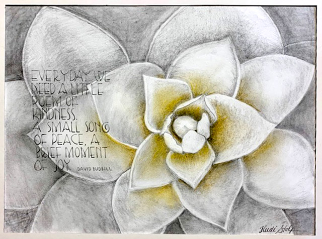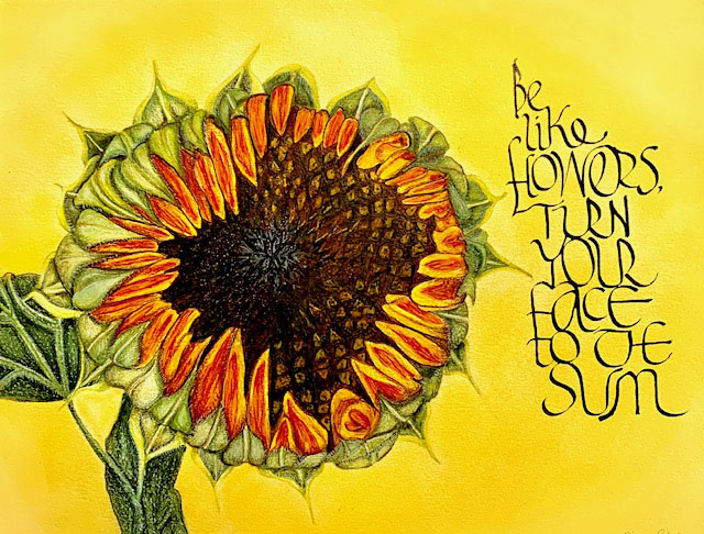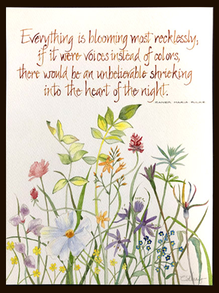 9" x 12" on Fabriano 140lb. HP Watercolor paper . Flowers: Comic Pen, Tsukinek Walnut Ink, watercolor paints. Writing: ruling pen, Windsor Newton Yellow Ochre ink.