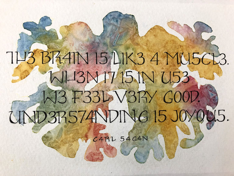 9” x 6" Background: watercolors and clear wrap, the white areas were covered with Liquid Frisket before the paint was applied. Writing: 005 micron pen. |