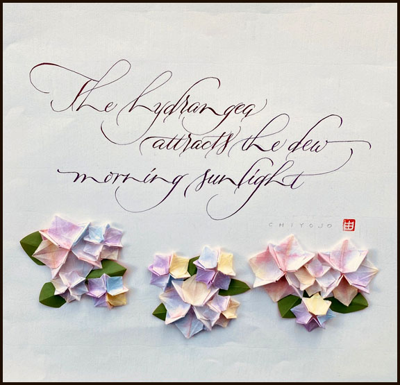 11” x 14” Ink on water color paper, Origami hydrangea with Orizome rice paper