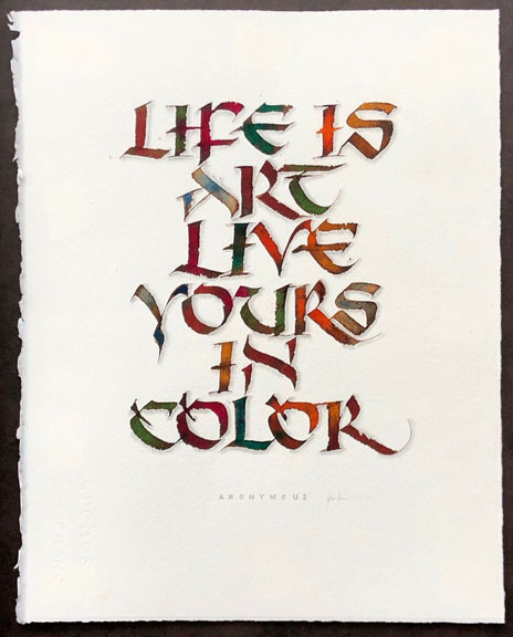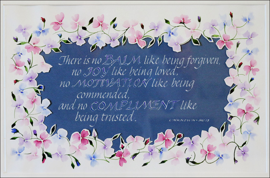 12 1/4” x 16 3/4”, watercolor, pointed brush, 1mm Brause and a 01 scroll nib, Dr. Ph. Martin’s Bleed-proof White |